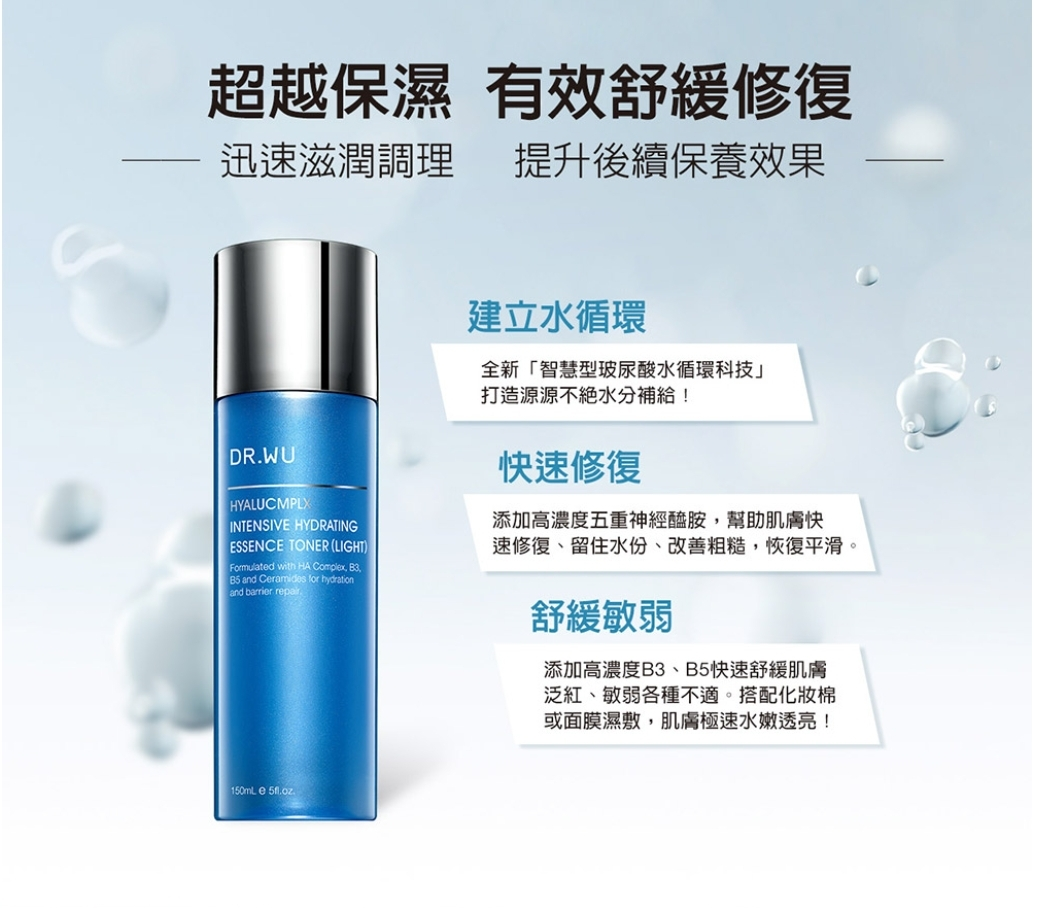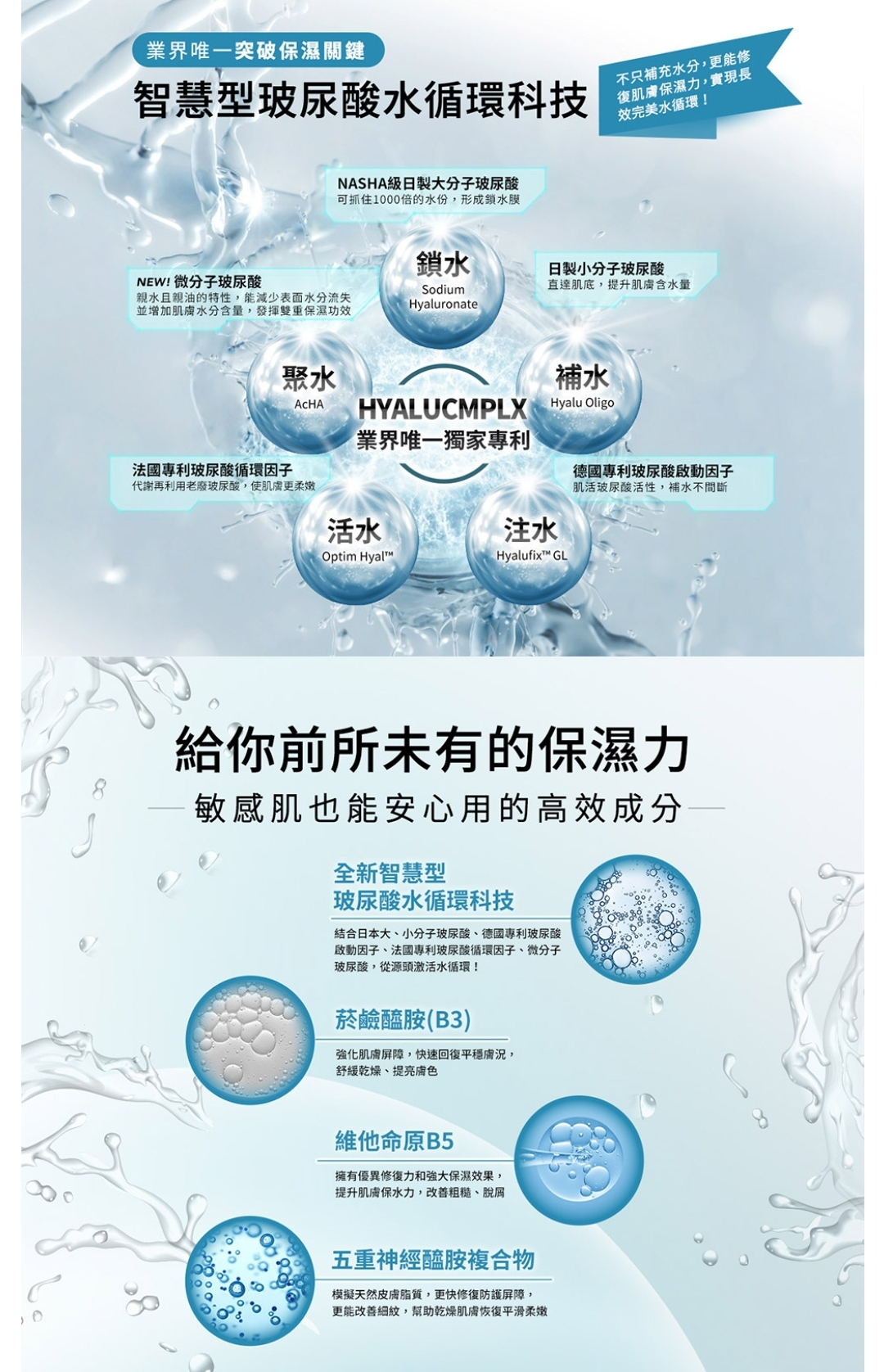 智慧型肌因活水科技: 業界唯一,日德法保濕專利,結合日本大分子玻尿酸,與專利小分子玻尿酸,達到外鎖水內補水,加上德國專利玻尿酸肌活因子與法國專利玻尿酸啟動因子,啟動深層水巡力,肌活保濕不間斷。