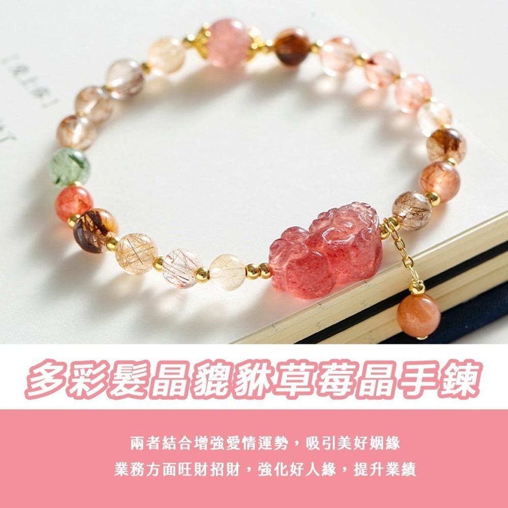 【品名】多彩髮晶貔貅草莓晶手鍊
