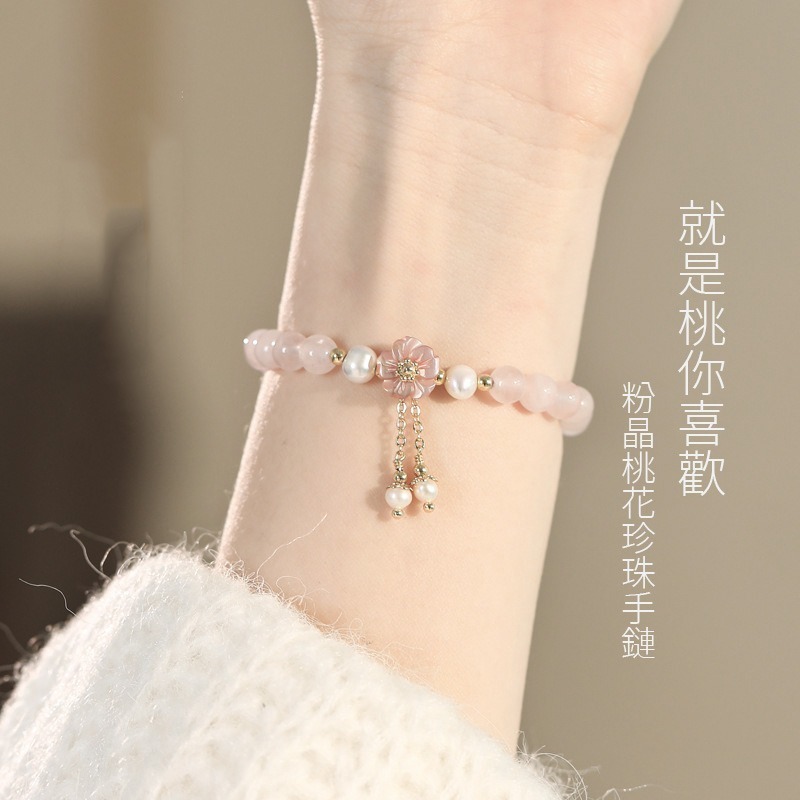 【品名】天然粉晶桃花珍珠水晶手鏈