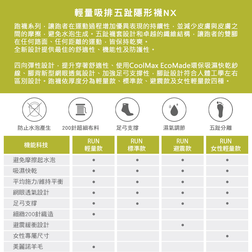 具有足背網眼透氣及環形足弓支撐設計,使用COOLMAX材質,無論長、短距離跑步訓練或是馬拉松賽事,都能維持足部乾爽並提供良好的耐磨性,給予足部最佳防護。