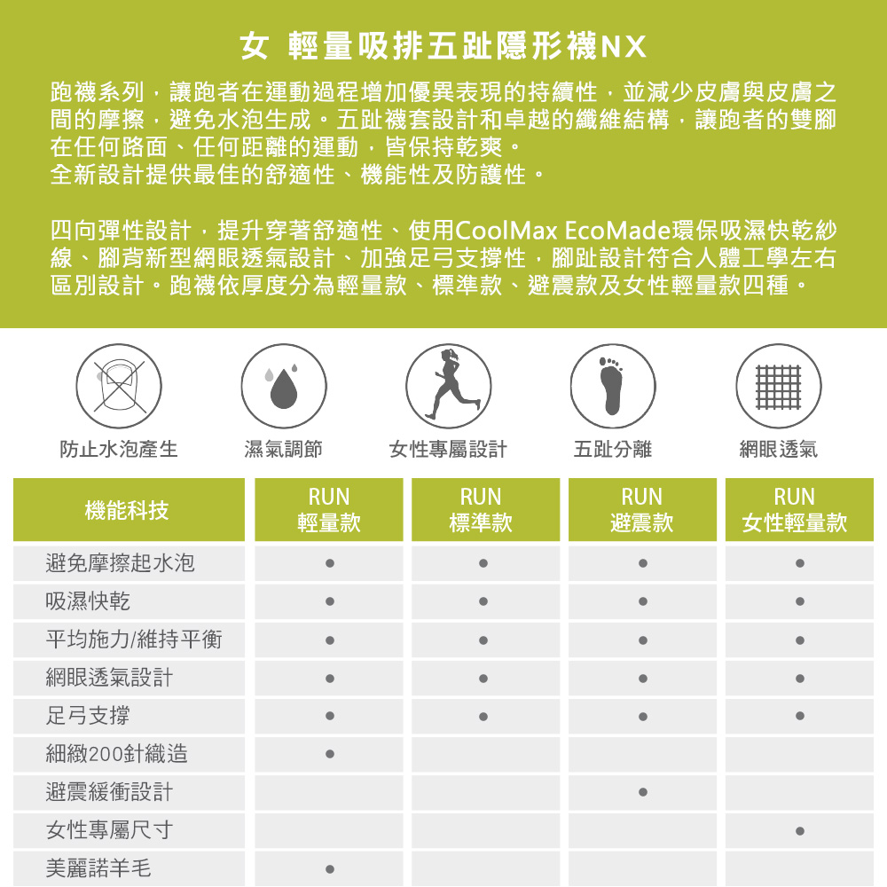 - 跑襪依厚薄度有分輕量款、標準款、避震款及女性輕量款四種。