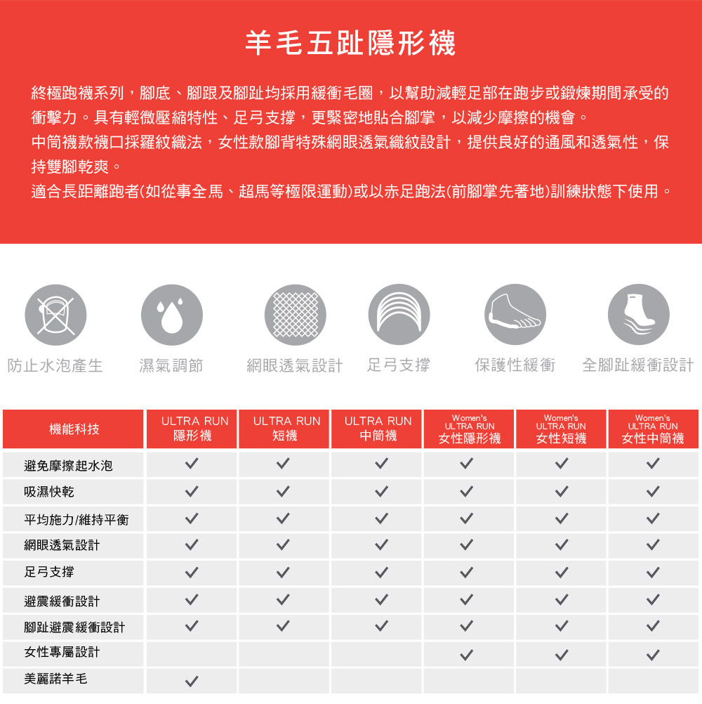 終極系列襪款,輕量加壓及線性結構設計,可提供足弓及腳踝更穩定的支撐。全腳底至腳趾毛圈緩衝舒適設計,可提升緩衝效能,吸收衝擊。