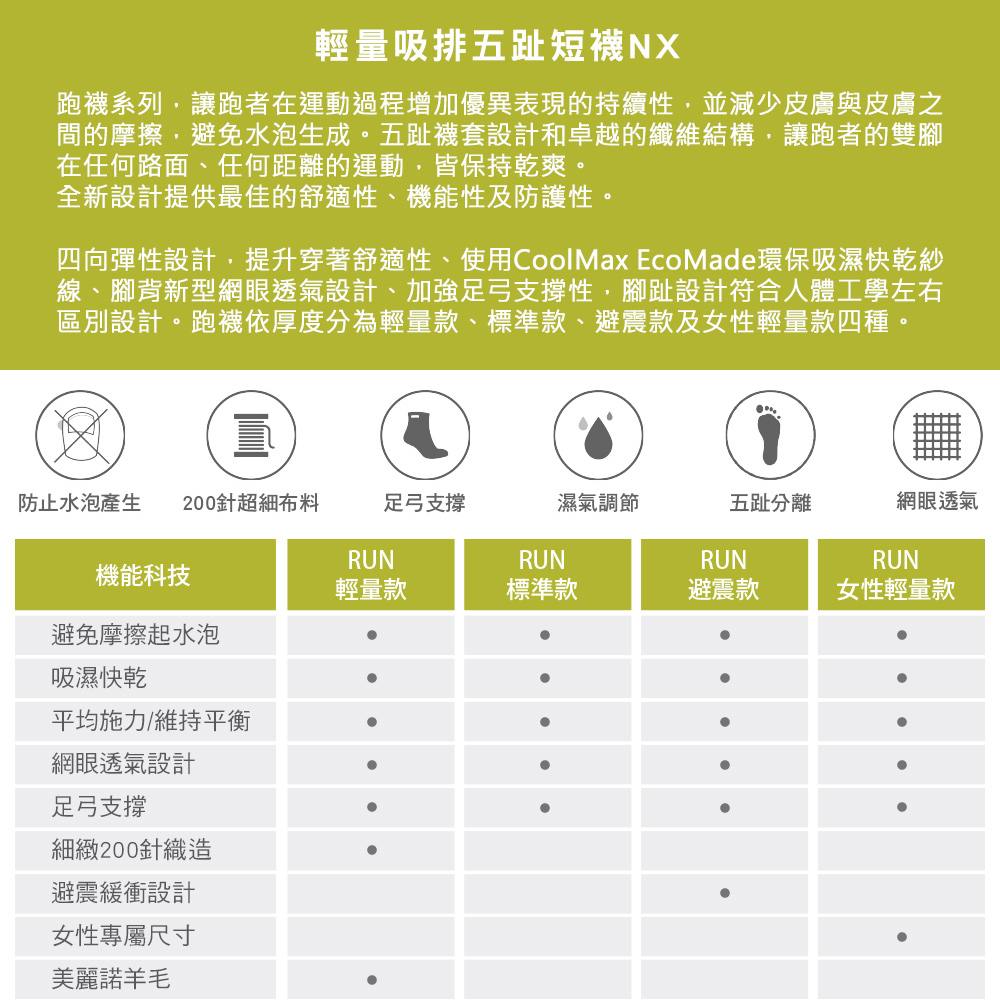 具有足背網眼透氣及環形足弓支撐設計,使用COOLMAX材質,無論長、短距離跑步訓練或是馬拉松賽事,都能維持足部乾爽並提供良好的耐磨性,給予足部最佳防護。