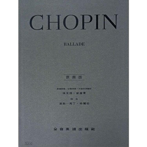 蕭邦四首敘事曲都可以算是蕭邦的傑作,也是蕭邦人生最燦爛的時期所作,敘事曲的形式是自由的,樂曲全部使用複合拍子,形式上完全不受任何曲式拘束。蕭邦藉由這些音樂來講述某種故事,故事內容據說是依據同鄉詩人詩作而來,樂曲中抽象性表露出民族主義精神上的的情感。 出版社:全音樂譜出版社 原文書名:Chopin Ballade 編訂者:埃瓦德 • 欽摩曼, 漢斯─馬丁 ‧ 特爾伯 系列名稱:原典版 總書頁:59 簡介 【序】 音樂創作打進了詩歌文學的領域是浪漫派時期的重要特徴之一。標題音樂,藝術歌曲的高度成就,以及修曼的偏好,把完成的作品追加詩化的標題,這些都指出了這條路徑的發展。奇怪的是,蕭邦居然在這種潮流裏那麼地安然自處。除了在他死後才出版的一些較不出名的歌曲之外,只有在他爲他的四首重要作品,命名爲“Ballade”時顯示出文學化的跡象,這四首作品在他生前即已出版。作品23與38若說是由於讀了麥克維茲的敍事詩而得來的靈感,其間的關係也十分模糊,要不是把蕭邦與這位詩人間的私人關係作爲證據,其實也看不出什麼來。 本册以年代先後編排之,其編訂原則仍根據本系列以前編纂蕭邦版本時所推演出來的方法。另外已單獨發行一個考正報告,在有關稿源的資料方面以及寫譜法的比較方面均提供詳盡的說明。斜字體的指法是取自於來源資料中。 目錄 CHOPIN 蕭邦 BALLADEN   1. CHOPIN 蕭邦 Ballade Opus 23•BI 66   2. CHOPIN 蕭邦 Ballade Opus 38•BI 102   3. CHOPIN 蕭邦 Ballade Opus 47•BI 136   4. CHOPIN 蕭邦 Ballade Opus 52•BI 146