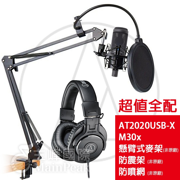 AT2020USB-X麥克風、M30x監聽耳機、原廠防震架(全配組合才有升級成原廠防震架)、懸臂式麥架(非原廠)、防噴網(非原廠)
