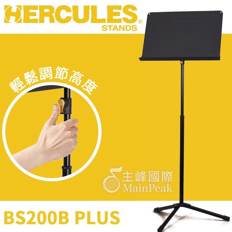 HERCULES BS200B PLUS 具有 EZ 握把和快速釋放結構,可輕鬆調節。結構堅固,可輕鬆存放在 BSC800 譜推車上。