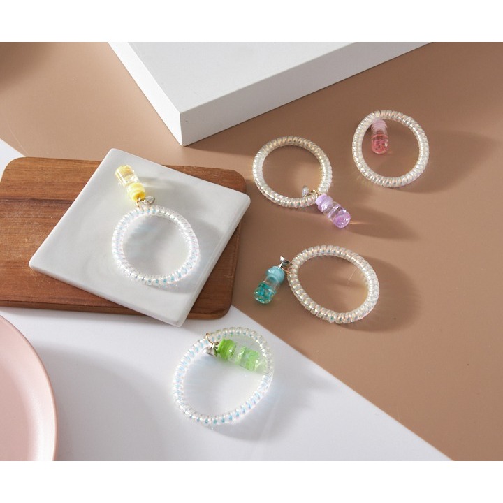 最新簡約風電話圈髮束設計,垂掛著可愛的小墜飾
