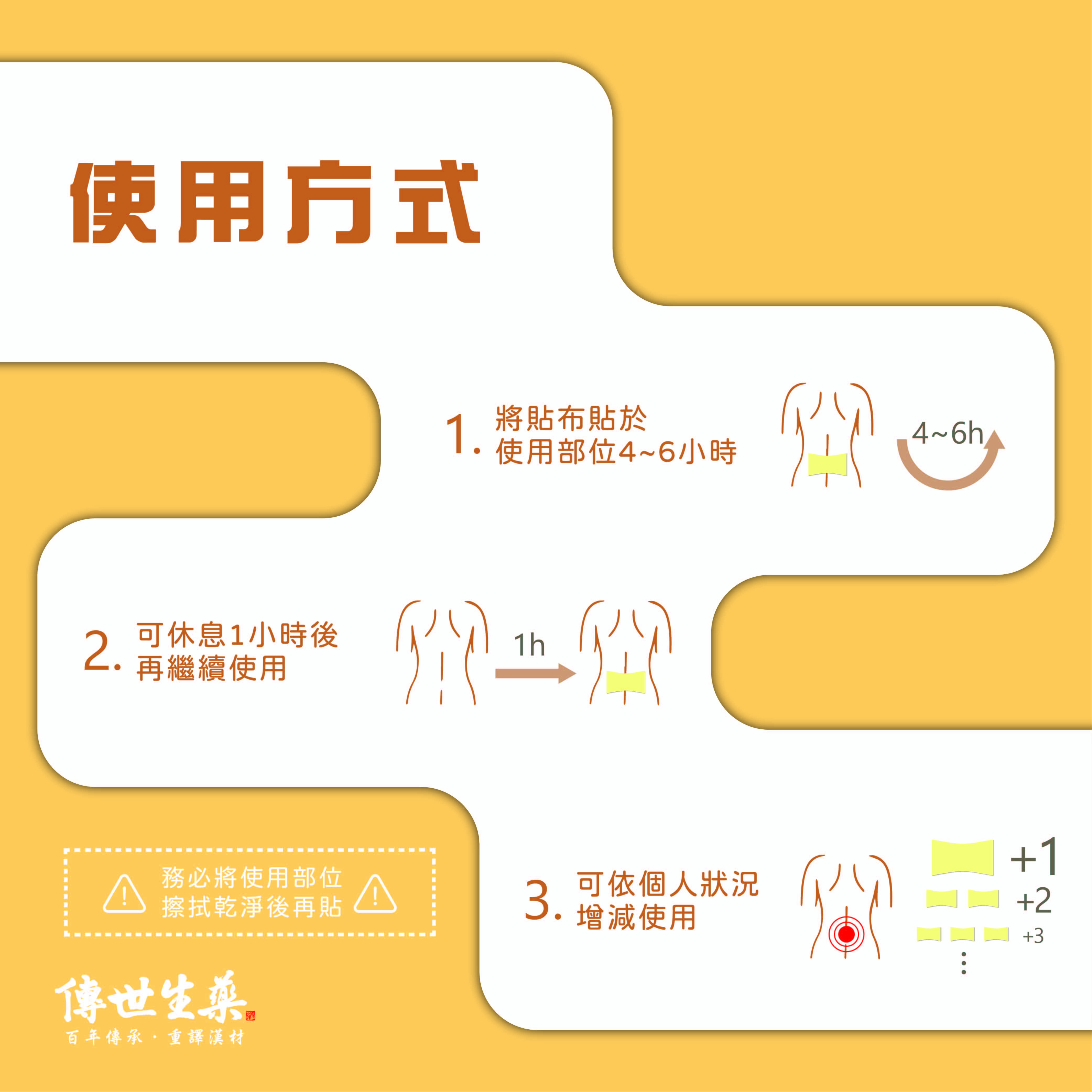 將貼布貼於使用部位4~6小時,可休息1小時後再繼續使用,可依個人狀況增減使用(務必將使用部位擦拭乾淨後再貼)