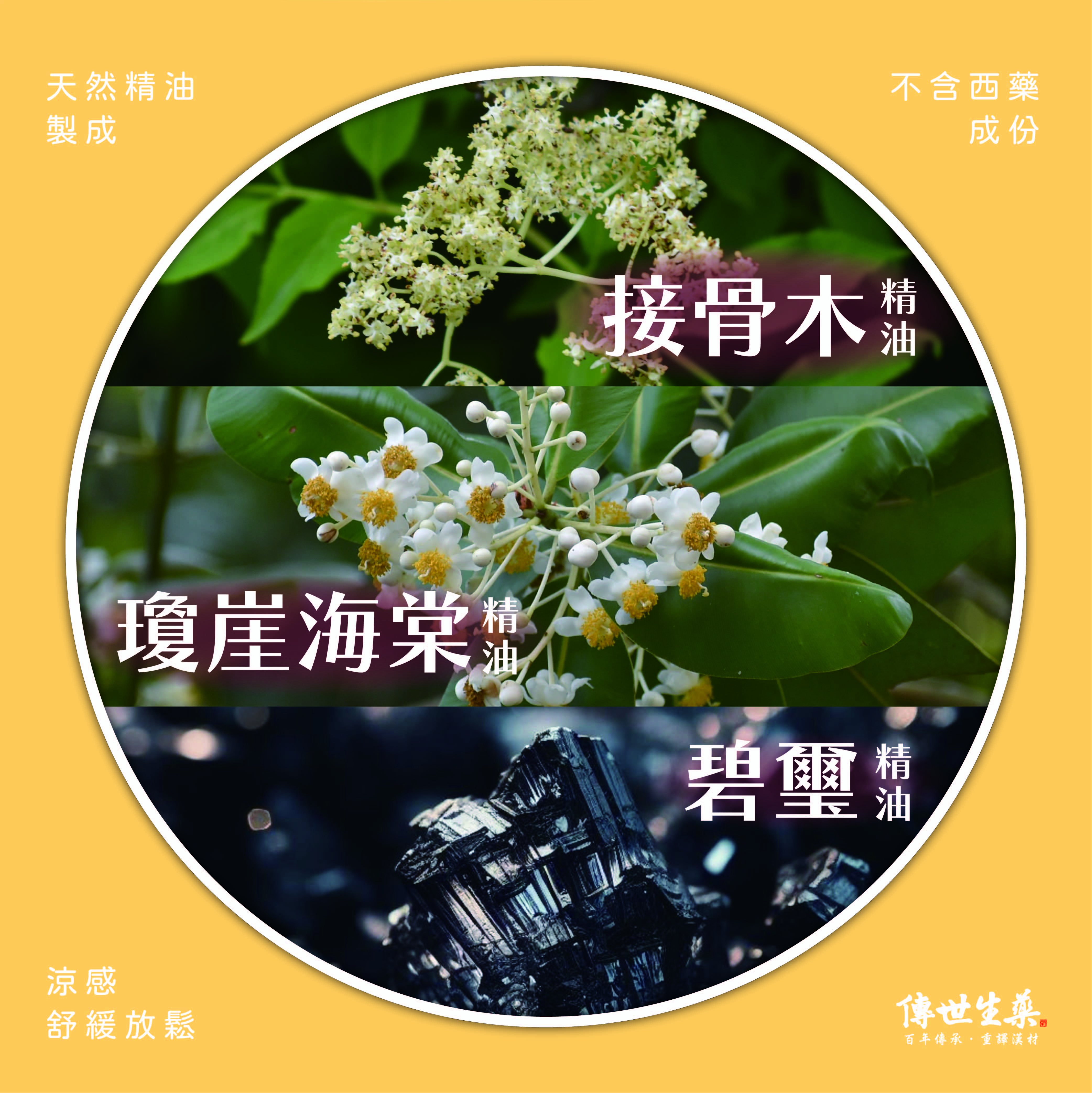 接骨木精油、瓊崖海棠油、碧璽精油、牛膝草精油、貓爪藤精油、荊芥精油、薄荷精油、尤加利葉精油、薰衣草香精、食用色素、樹脂。