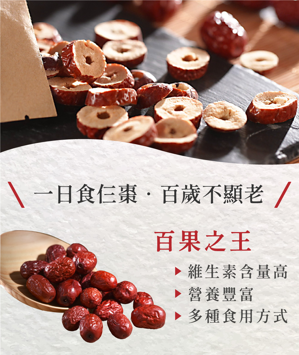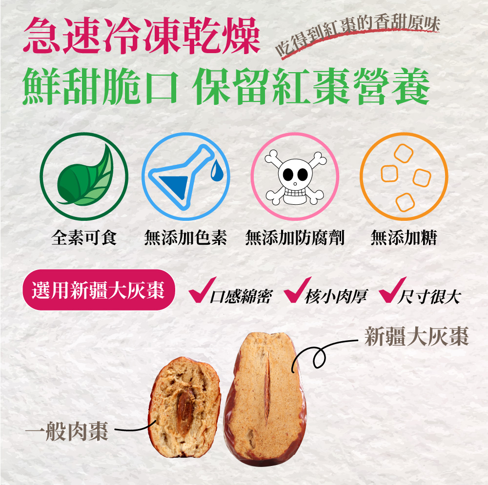 新鮮紅棗切片,急速冷凍乾燥,保留紅棗營養,隨時隨地可享用,補充能量。