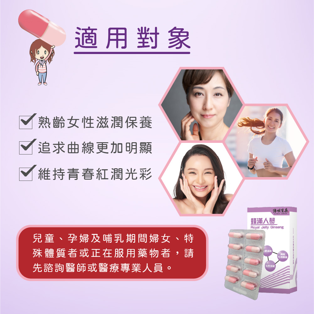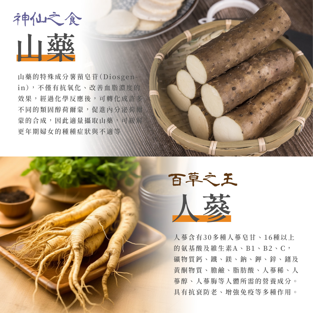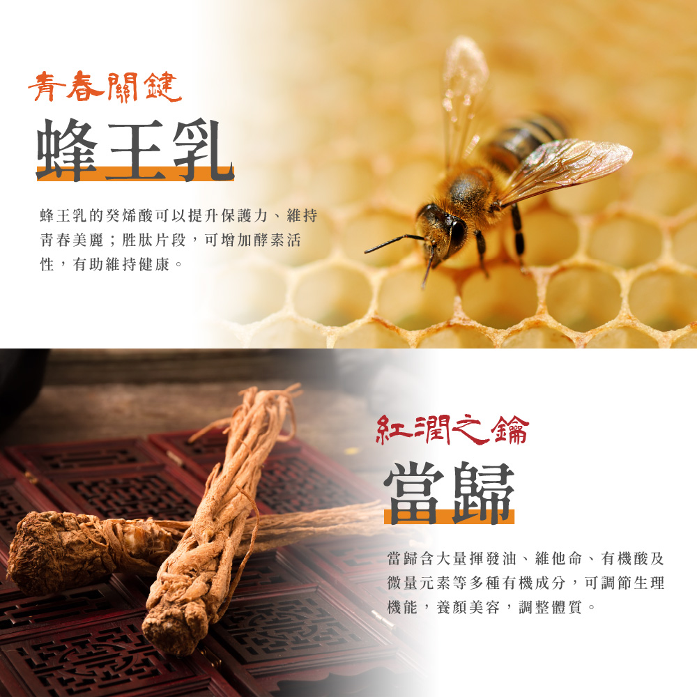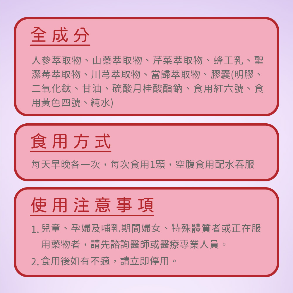 人參萃取物、山藥萃取物、芹菜萃取物、蜂王乳、聖潔莓萃取物、川芎萃取物、當歸萃取物、膠囊(明膠、二氧化鈦、甘油、硫酸月桂酸酯鈉、食用紅六號、食用黃色四號、純水)