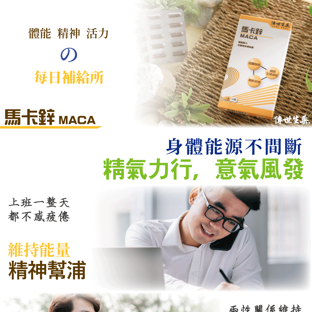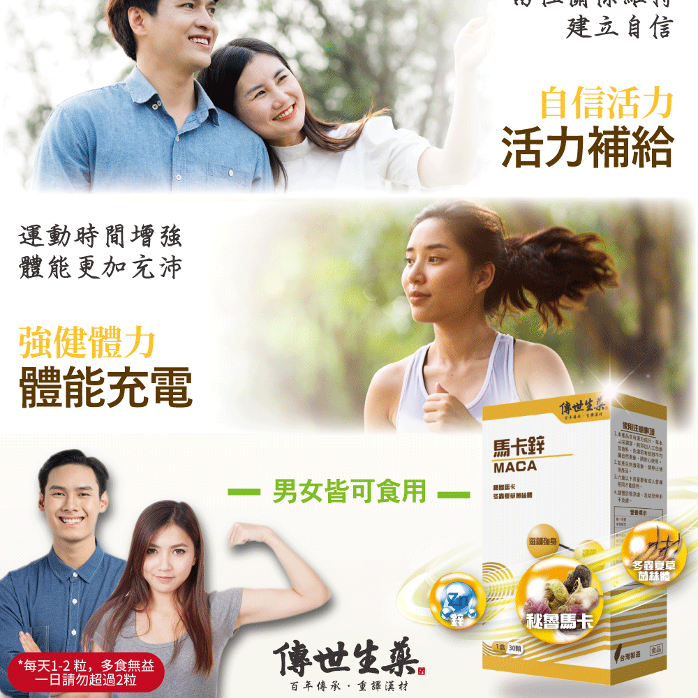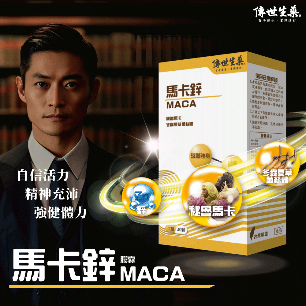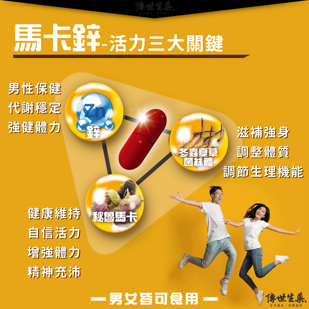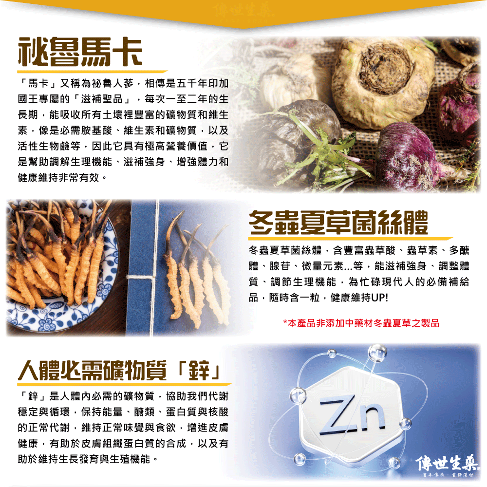 L-精氨酸、馬卡粉(祕魯)、啤酒酵母粉(含維生素B群)、馬卡萃取物(馬卡萃取物、辛烯基丁二酸鈉澱粉、二氧化矽)、複合甘胺酸鋅(甘胺酸鋅、檸檬酸、二氧化矽)、磷酸鈣、冬蟲夏草菌絲體(中華被毛孢Hirsutella sinensis mycelia) 、膠囊、(明膠、硫酸月桂酯鈉、二氧化鈦、純水、甘油、食用紅色六號、食用藍色一號、食用黃色五號)