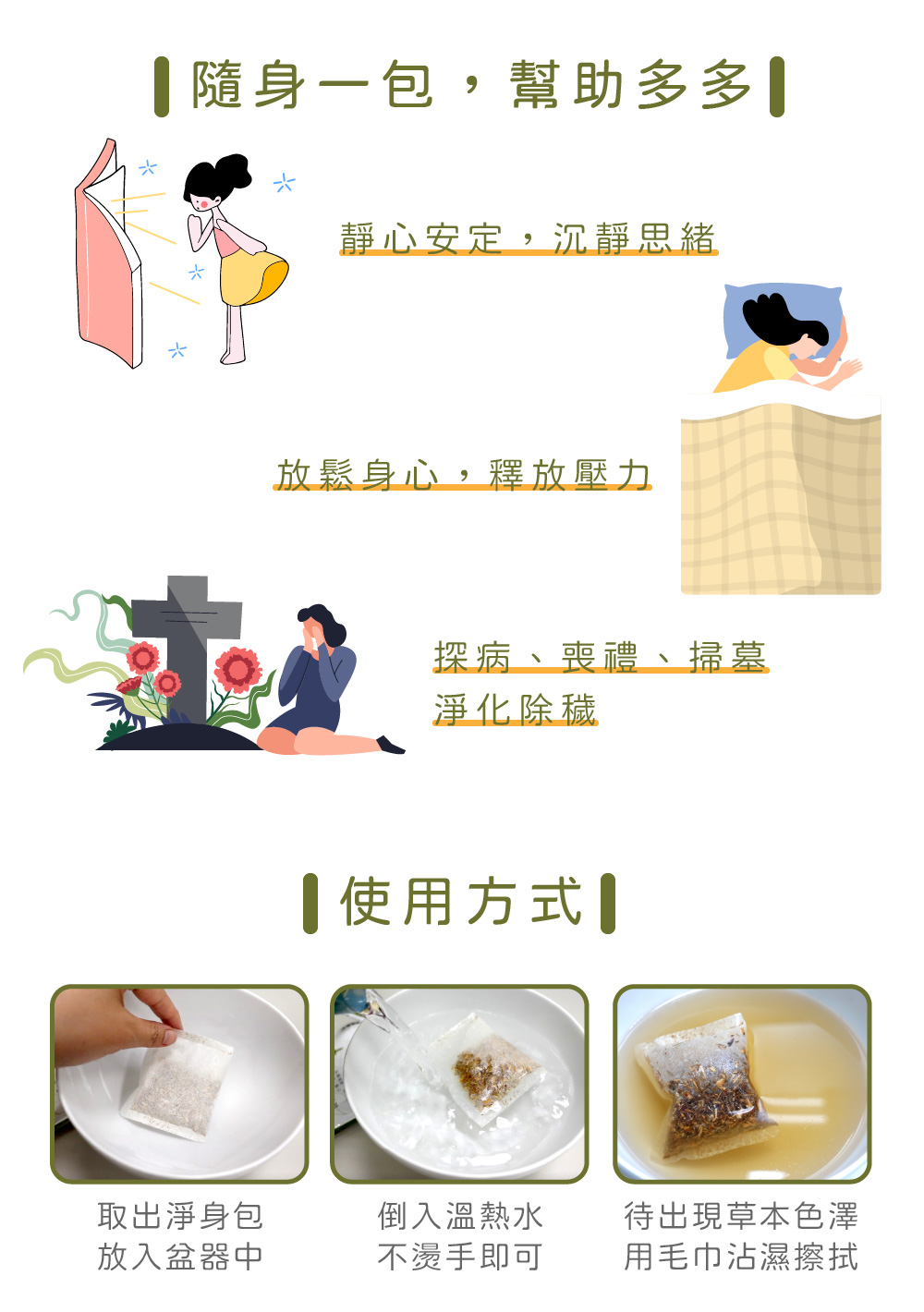 將外包裝撕開之後、把內裝過濾袋浸泡於熱水中調和水後即可梳洗沐浴。探病、收驚、外出、出國遊玩必備,洗掉不舒爽、洗去穢氣、趨吉好平安,心靈舒爽守護神。