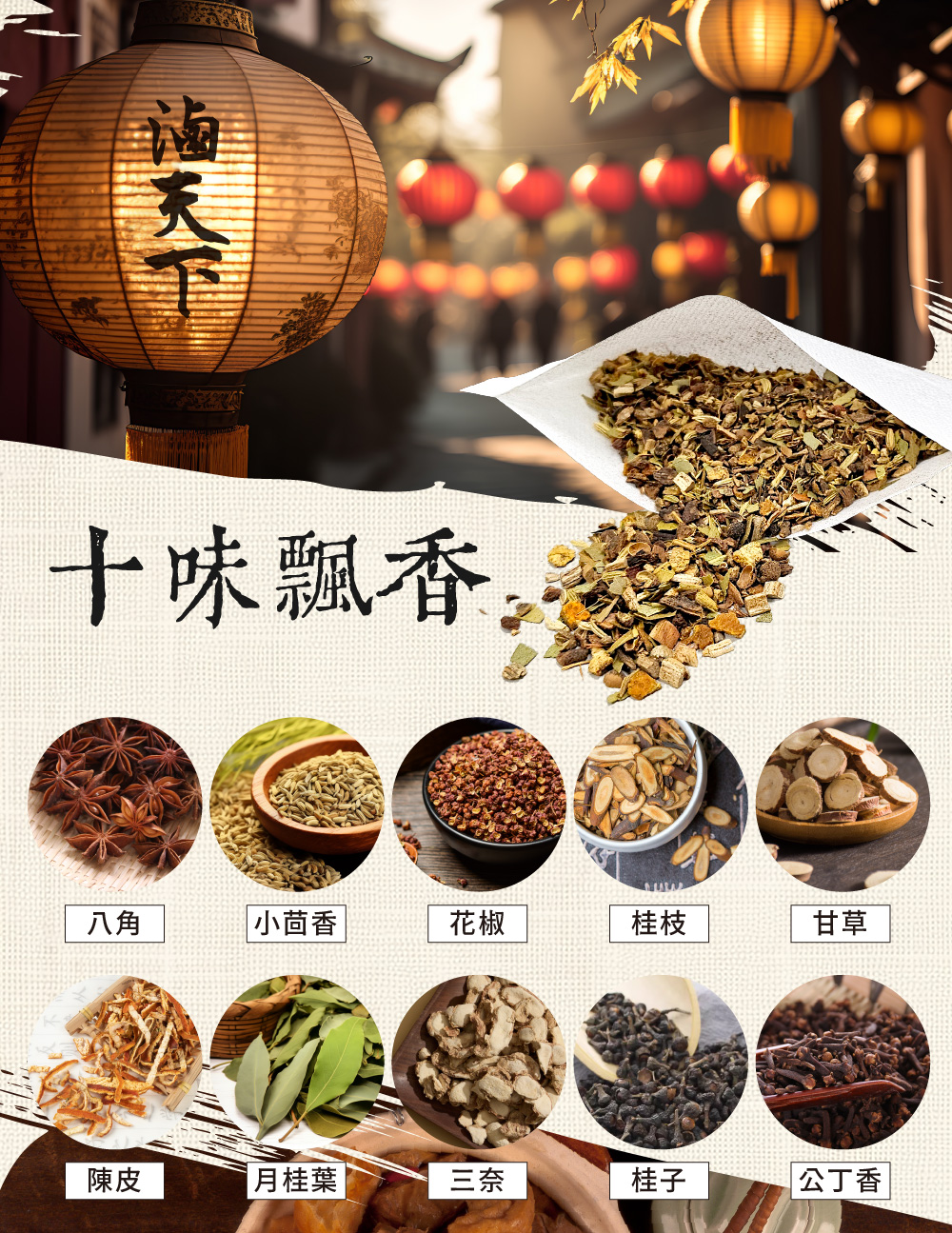 八角、小茴香、花椒、桂枝、甘草、陳皮、月桂葉、三奈、桂子、公丁香