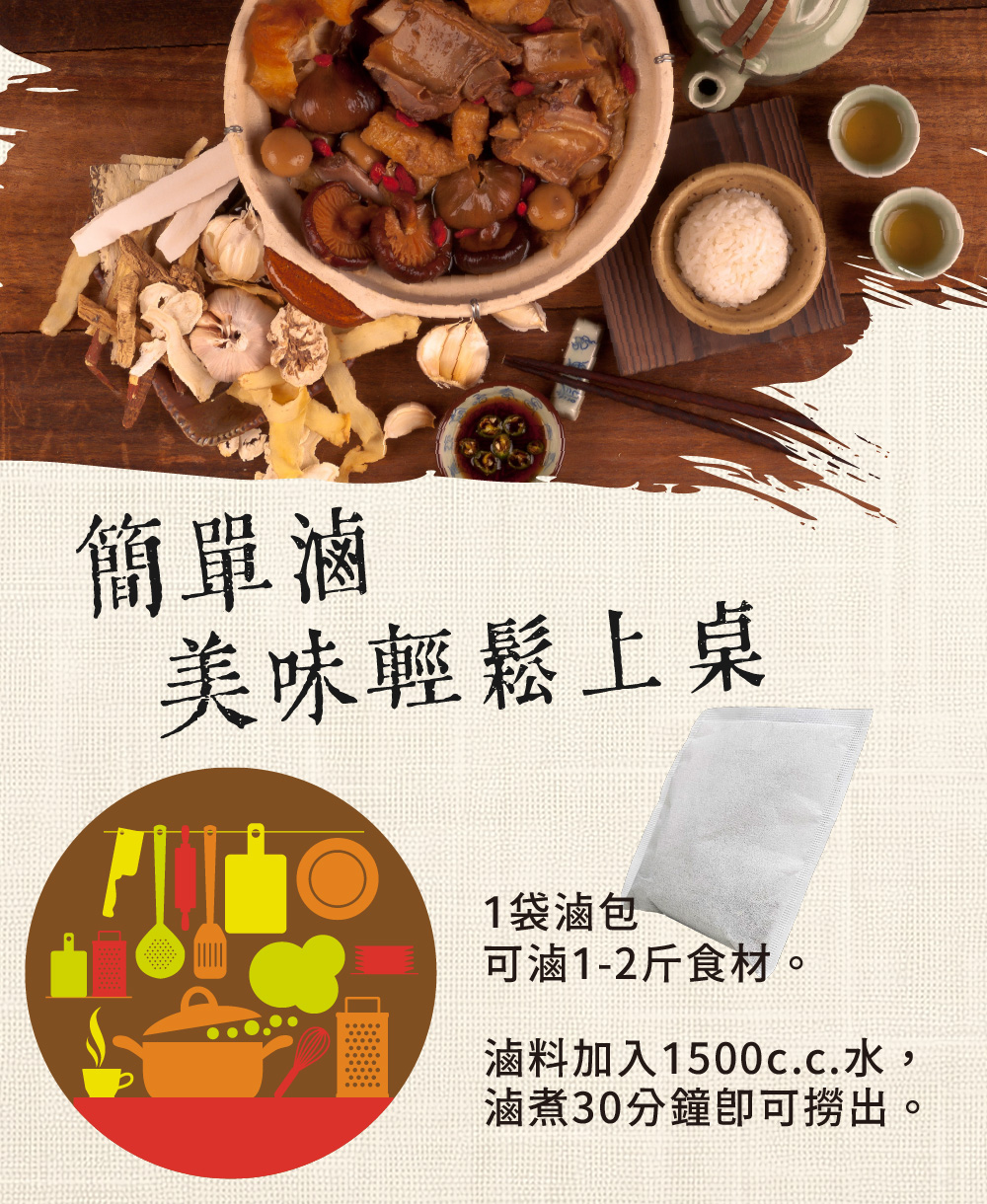 1袋滷包搭配1-2斤滷料加入1500c.c.水,滷煮30分鐘即可撈出。
