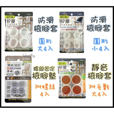 品名:矽膠椅腳套-圓形大4入 規格:約直徑3.9X高3cm(±5%) 材質:矽膠 數量:4入 產地:中國 品名:矽膠椅腳套-圓形小4入 規格:約直徑2.6X高2.7cm(±5%) 材質:矽膠 數量:4入 產地:中國 品名:螺絲止滑椅墊-圓4入 材質:椅腳墊-PVC聚氯乙烯 / 螺絲-不銹鋼 規格:椅腳墊-直徑0.4X厚0.7cm/ 螺絲-直徑0.4X高1.3cm 數量:4入 產地:中國 品名:靜音腳椅套-毛氈大4入 材質:矽膠、聚酯纖維 規格:直徑3.9cm 數量:4入 產地:中國