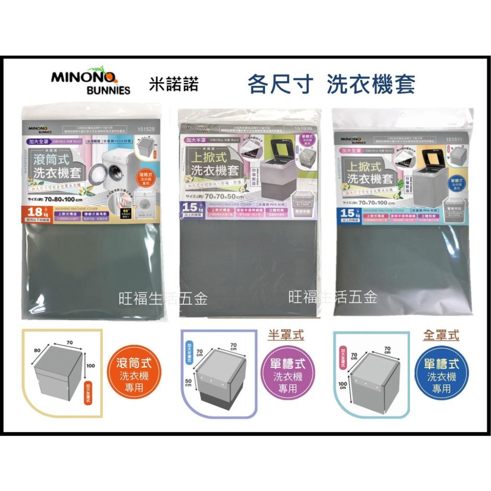 品名:米諾諾-加大「滾筒式全罩」洗衣機套 尺寸:約長70x寬80x高100cm(±5%) ______________________________________________________________ 品名:米諾諾-加大「直立式半罩」洗衣機套 尺寸:約長70x寬70x高50cm(±5%) ______________________________________________________________ 品名:米諾諾-加大「直立式全罩」洗衣機套 尺寸:約長70x寬70x高100cm(±5%) 材質:PEVA聚乙烯-醋酸乙烯酯 產地:台灣 清潔方式:若表面有髒污灰塵,以濕布輕輕擦拭即可。
