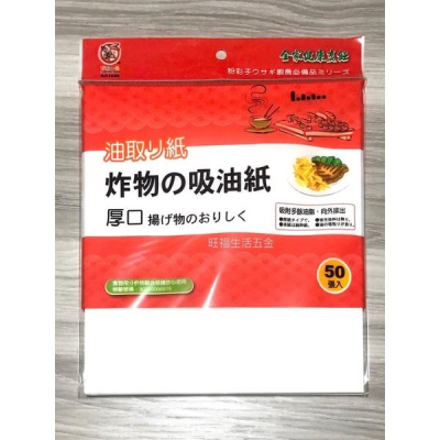 品名 : 炸物吸油紙 50入 材質 : 木漿純紙 規格 : 20.3*22.7cm 產地 : 台灣製造