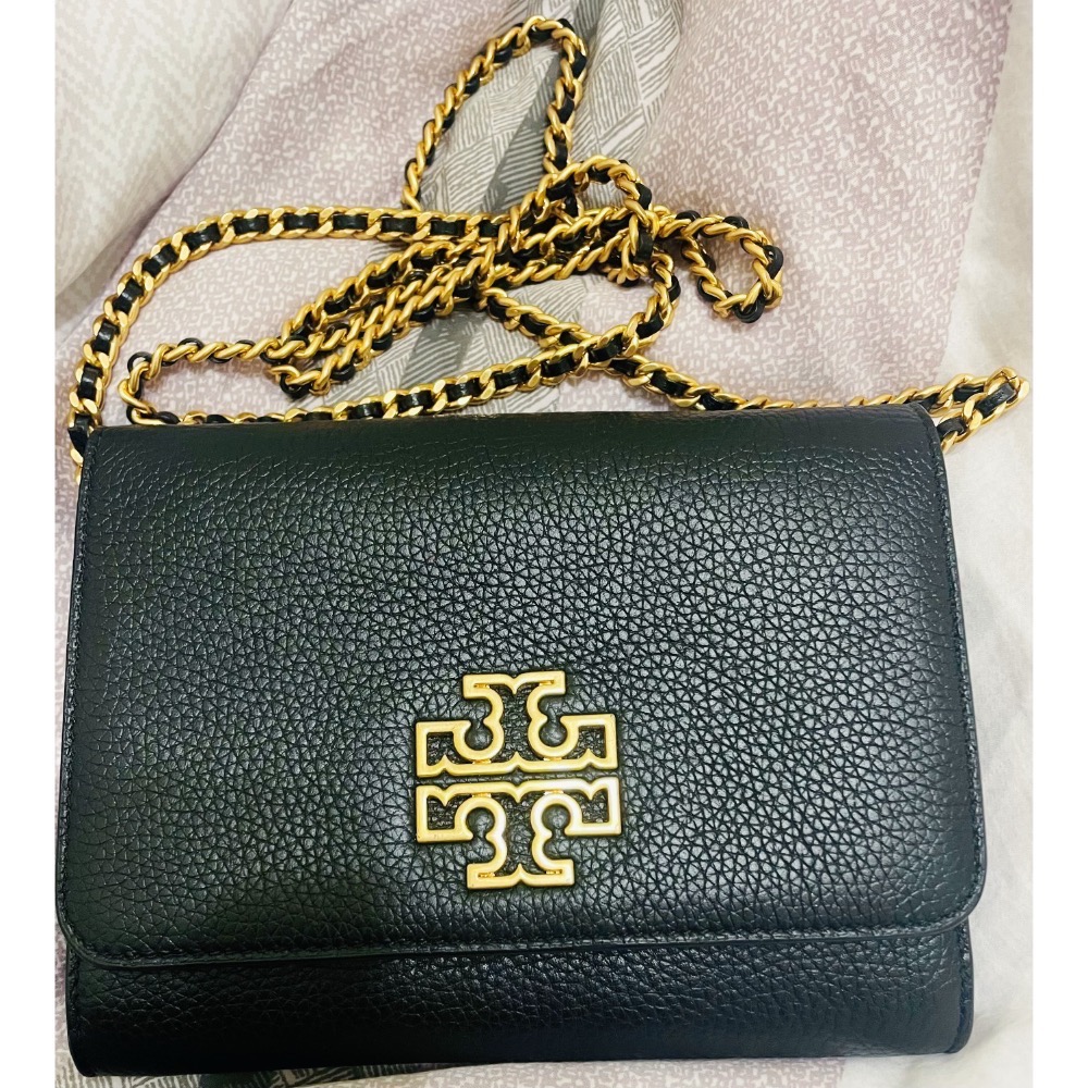 TORY BURCH Britten 金字簍空大T LOGO牛皮釦式鏈帶肩背包(黑)