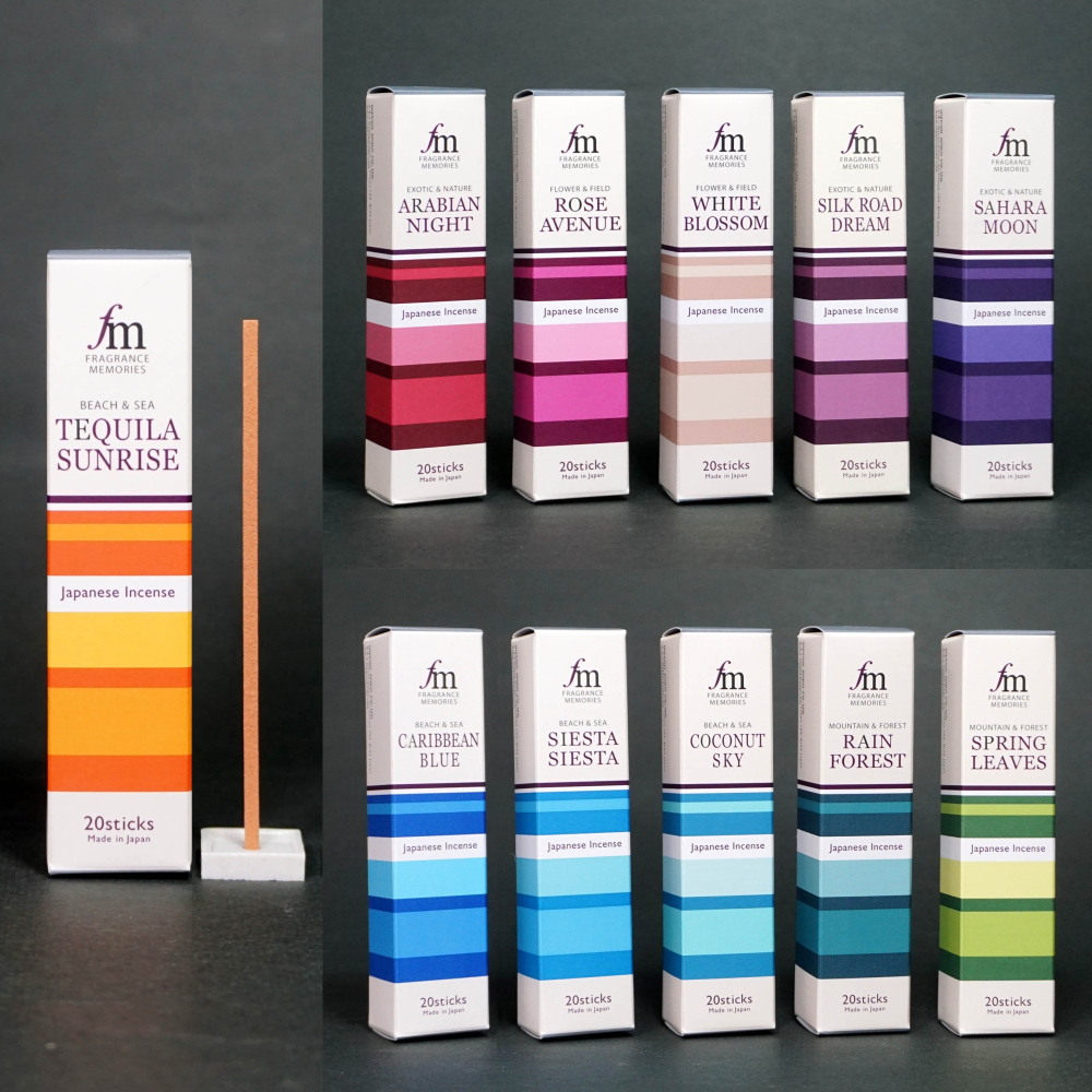 此系列以大自然為主題的《Fragrance Memories》系列線香,包含:【CARIBBEAN BLUE】、【WHITE BLOSSOM】、【ARABIAN NIGHT】、【SILK ROAD DREAM】、【SIESTA SIESTA】、【ROSE AVENUE】、【SAHARA MOON】、【COCONUT SKY】、【RAIN FOREST】、【SPRING LEAVES】、【TEQUILA SUNRISE】,共11款香味,是日本香堂經典暢銷的系列線香之一,點燃後,獨特的香氛飄散居家空間,就如同大自然賜予我們的珍寶及祝福,令人心靈舒適。
