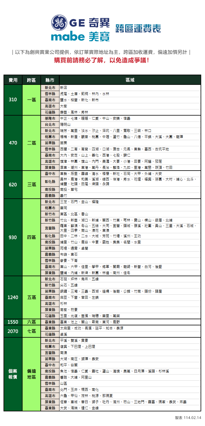 ※安裝處若無電梯需收取樓層搬運費,請至站內分類:其他服務「樓層費」加購。