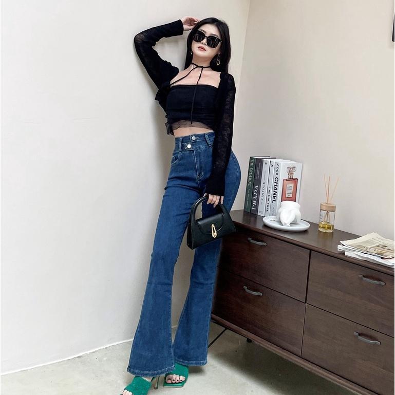 【DOE.FF】原色雙釦包臀牛仔喇叭褲 (現貨) 喇叭褲 顯瘦長褲 牛仔長褲 長褲女 高腰長褲 闊腿褲 女裝 辣妹風