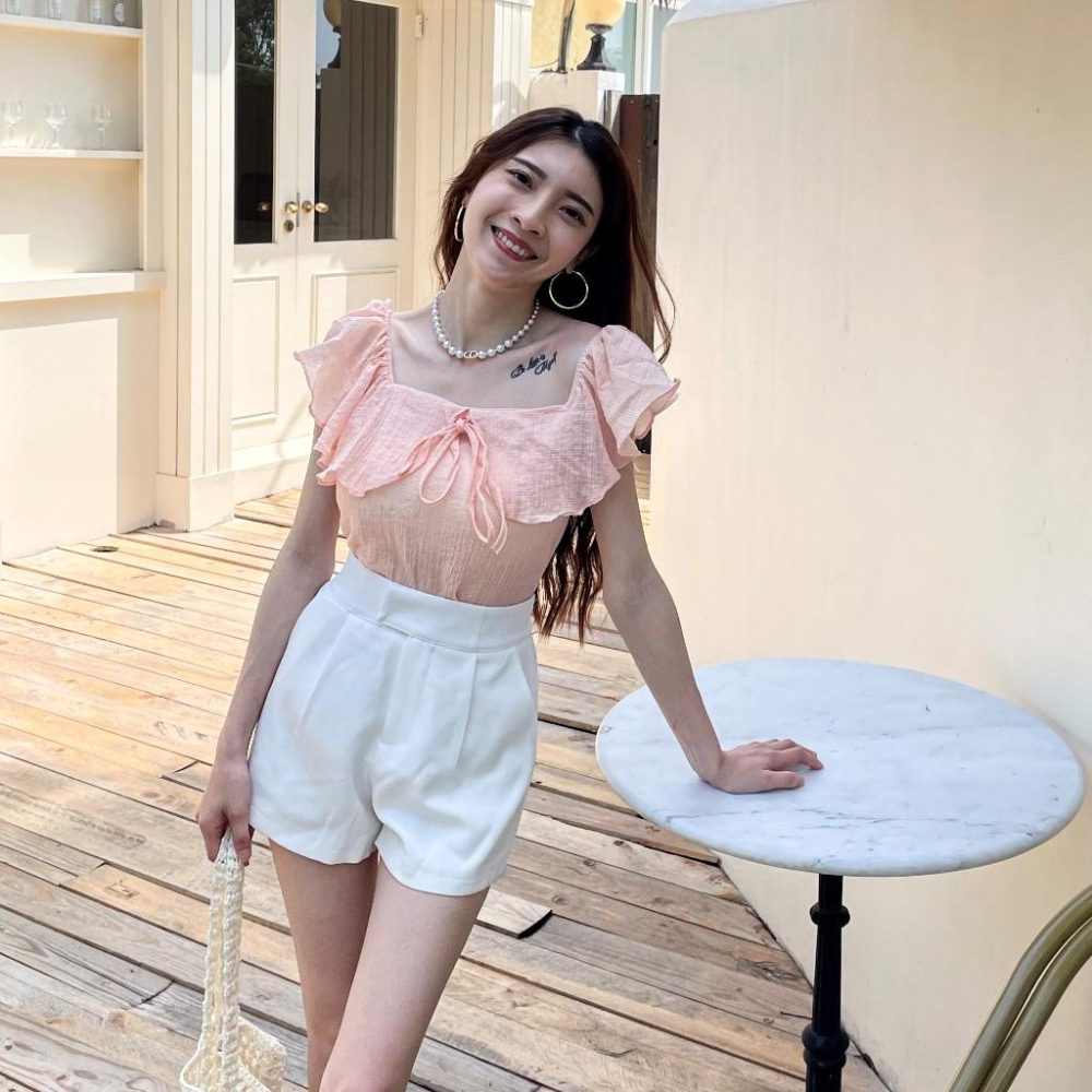 【DOE.FF】 氣質荷葉一字領上衣 (現+預) 短版上衣 雪紡上衣 粉色上衣 露肩上衣 平口上衣 短袖上衣 上衣女