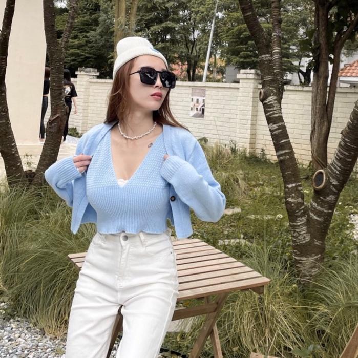 【DOE.FF】歐美V領織紋兩件套|現貨|女裝 秋冬 毛衣 針織外套 短版上衣 套裝女 背心女打底衫 針織衫 套裝女