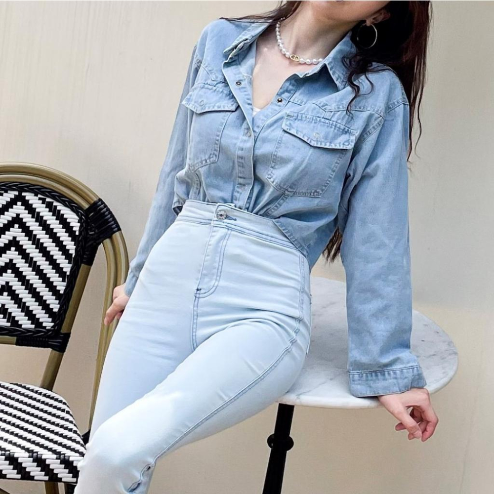 【DOE.FF】 弧形短版牛仔襯衫 (現+預) 牛仔外套 單寧外套 短外套 短版外套 襯衫女 短版襯衫 防曬外套