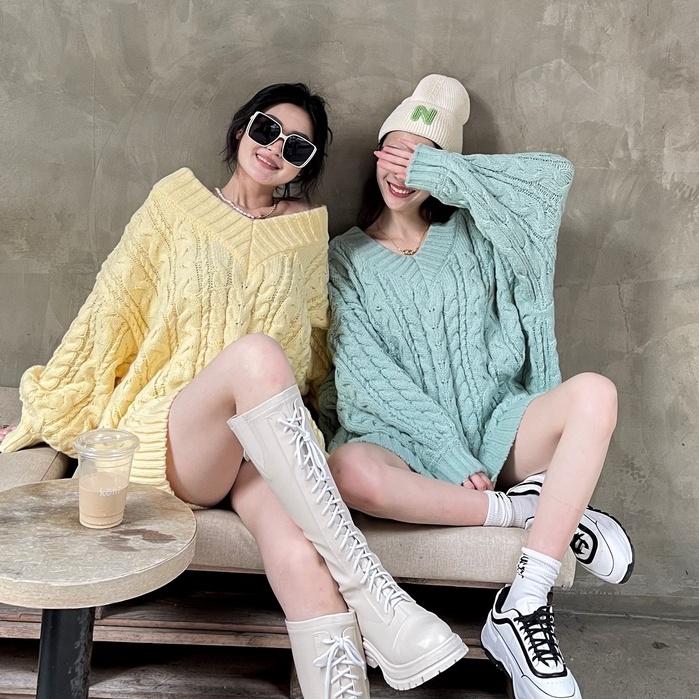 【DOE.FF】彩麻花寬毛衣|現貨|寬鬆毛衣 下半身失蹤 長版毛衣 韓國 毛衣女 V領毛衣 韓國 韓版 oversize