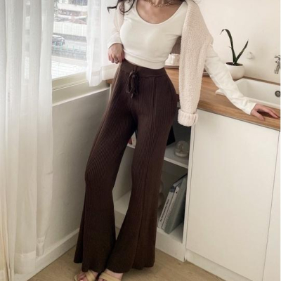 【DOE.FF】厚磅坑條針織寬褲|現貨| 針織長褲 針織寬褲 闊腿褲 高腰長褲 長褲女 顯瘦長褲 牛仔長褲 針織 毛衣