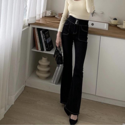 【DOE.FF】 韓國車線俐落長腿喇叭褲 (現貨) 牛仔長褲 牛仔褲 長褲女 喇叭褲 顯瘦長褲 高腰長褲 辣妹風 寬褲
