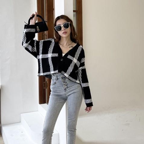 【DOE.FF】黑白大格厚磅毛衣|現貨|針織外套 寬鬆毛衣 毛衣女 短版毛衣 V領毛衣 韓國 韓版 辣妹 針織衫 上衣女
