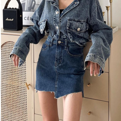 【DOE.FF】鬚邊包臀牛仔短裙 ( 現貨 ) 包臀短裙 牛仔短裙 a字裙 牛仔裙 顯瘦短裙 包腰短裙 短裙女