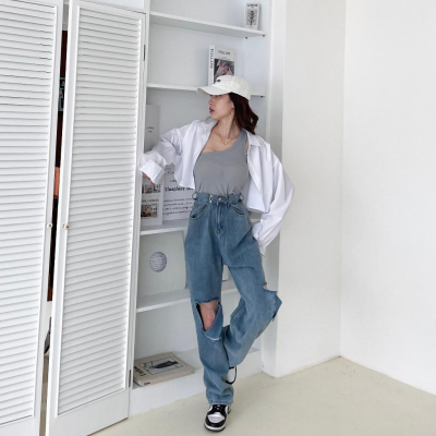 【DOE.FF】 扣環割破牛仔寬褲 S~XL (現貨) 牛仔褲 長褲女 寬褲 直筒褲 顯瘦長褲 男友褲 中低腰 女裝