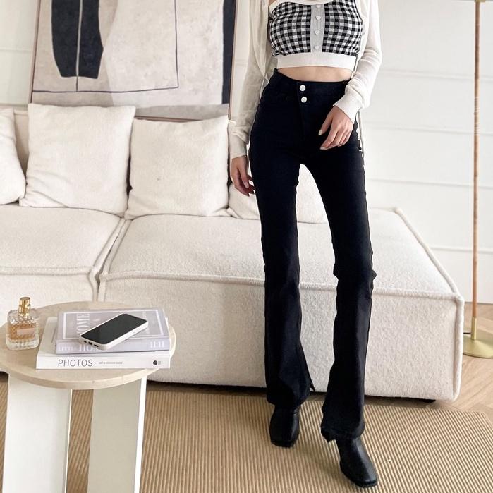 【DOE.FF】 兩釦開岔高腰牛仔喇叭褲 |現貨| 長褲女 顯瘦長褲 喇叭長褲 高腰長褲 牛仔褲 牛仔長褲 喇叭褲