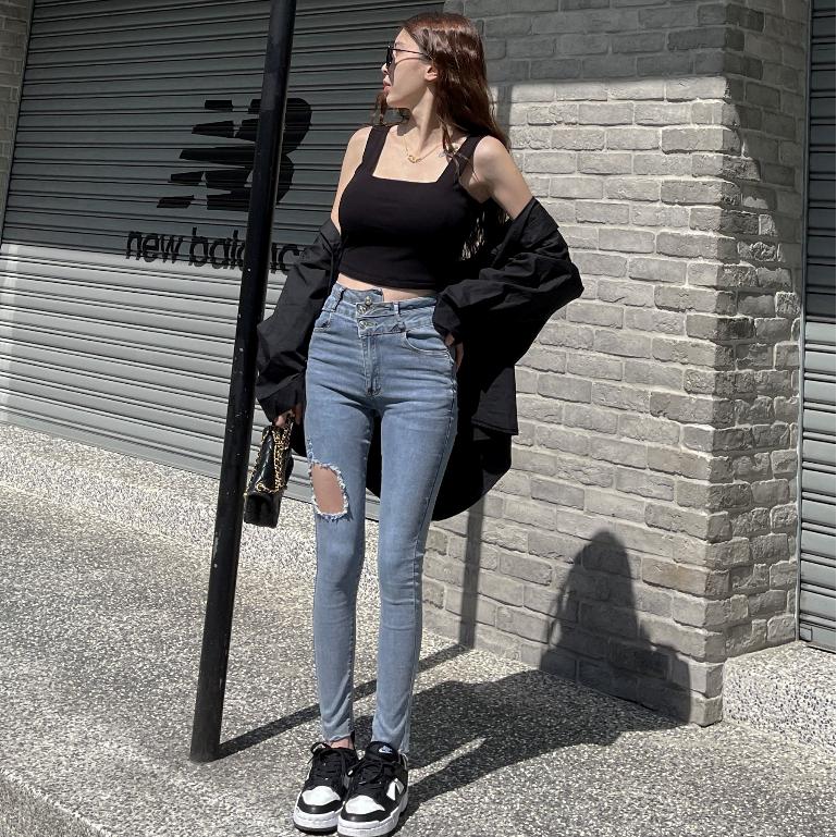 【DOE.FF】割破八分牛仔褲 (現貨) 窄管褲 長褲女 緊身褲 顯瘦長褲 高腰長褲 小腳褲 女裝 牛仔長褲