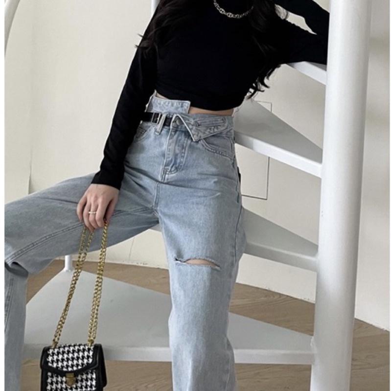 【DOE.FF】 造型假皮帶淡藍直筒褲|現貨|牛仔褲 男友褲 寬褲 牛仔長褲 長褲女 顯瘦長褲 高腰長褲