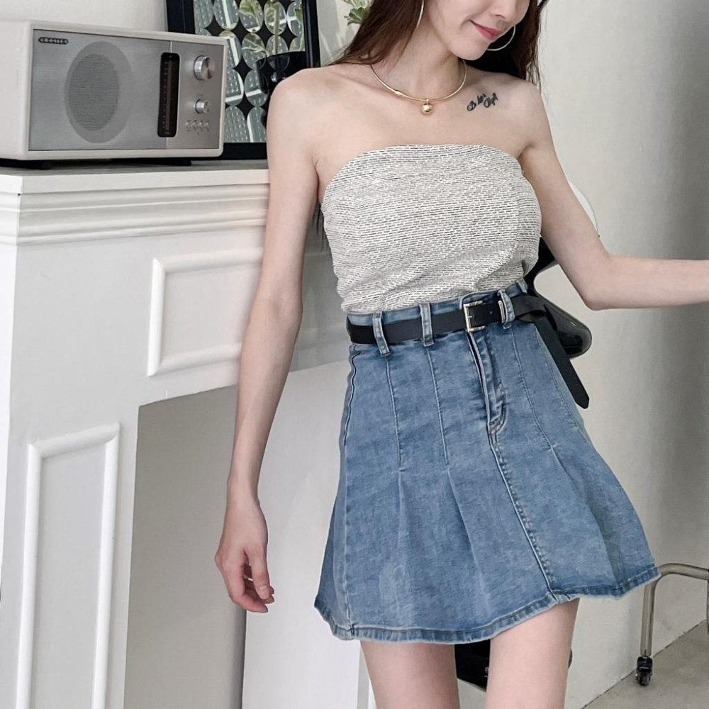 【DOE.FF】 附皮帶百摺牛仔短裙 (現貨) 百褶裙 褲裙 短裙 a字裙 高腰短裙 牛仔裙 迷你裙 顯瘦短裙 裙子女