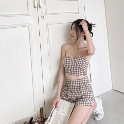【DOE.F拍】格紋桃心馬甲短褲套裝|現貨| 兩件式套裝 韓國 韓版 辣妹套裝 平口背心 雪紡套裝