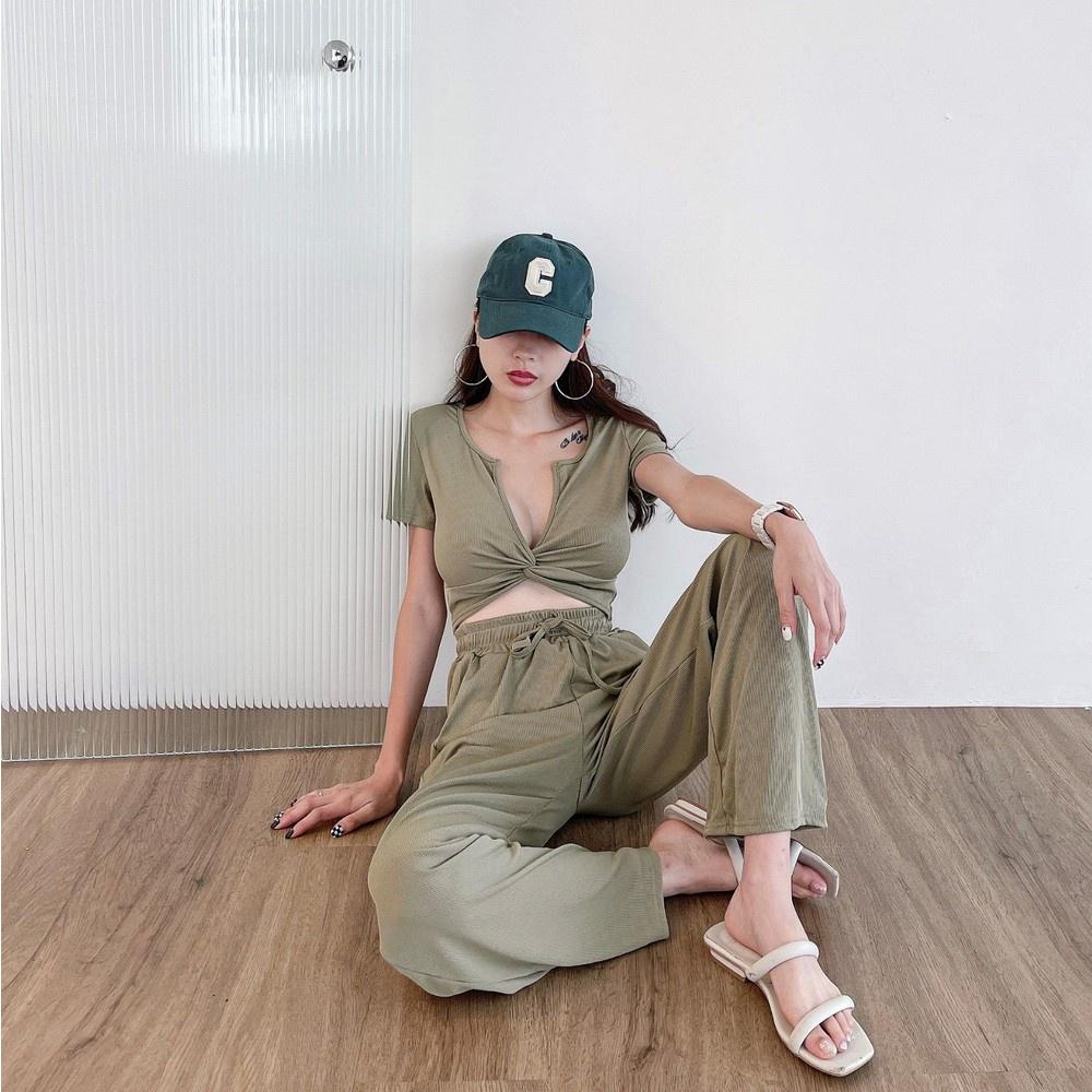 【DOE.FF】V領扭結寬褲套裝 (現貨·福利品) 套裝女 寬褲 闊腿褲 長褲女 辣妹套裝 女裝 短版上衣 短t