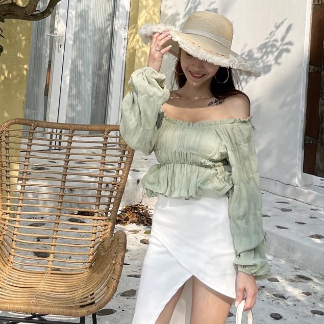 【DOE.FF】露肩縮腰上衣 (現貨・福利品) 一字領 露肩上衣 一字領上衣 辣妹風 辣妹上衣 女裝 小香風 短版上衣