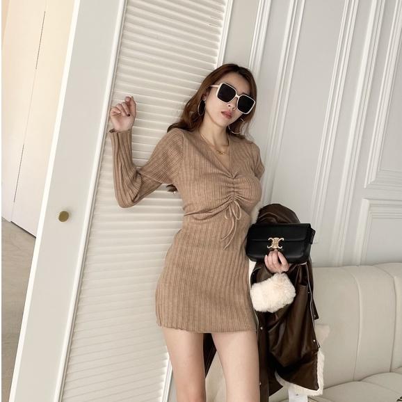 【DOE.FF】歐美抽繩針織抓皺短洋|現貨| 連身裙 短洋裝 長袖洋裝 V領洋裝