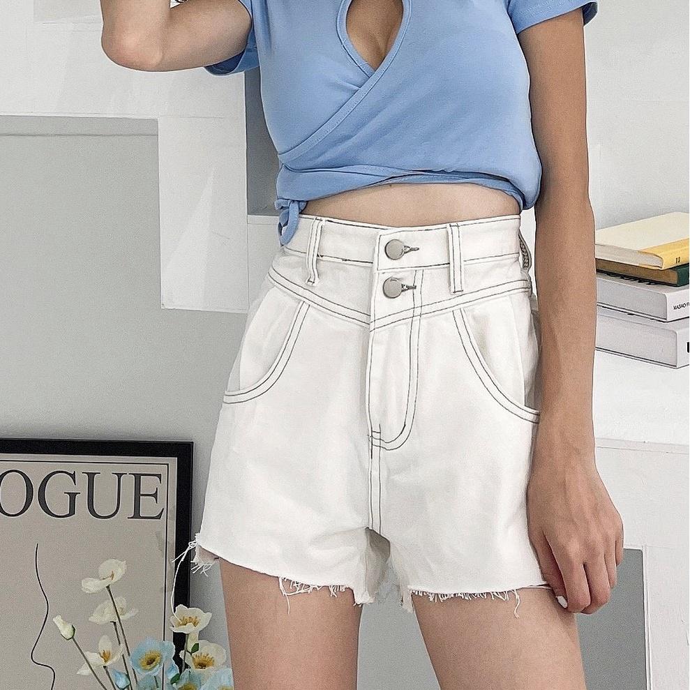 【DOE.FF】純白車線牛仔短褲 (現貨) 牛仔短褲 短褲女 高腰短褲 顯瘦短褲 闊腿褲 褲裙 女裝 牛仔褲 辣妹風