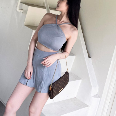 【DOE.FF】 顯瘦削肩渡假套裝 (現貨) 套裝女 削肩背心 褲裙女 顯瘦短裙 高腰短裙 休閒套裝 短裙女 SET