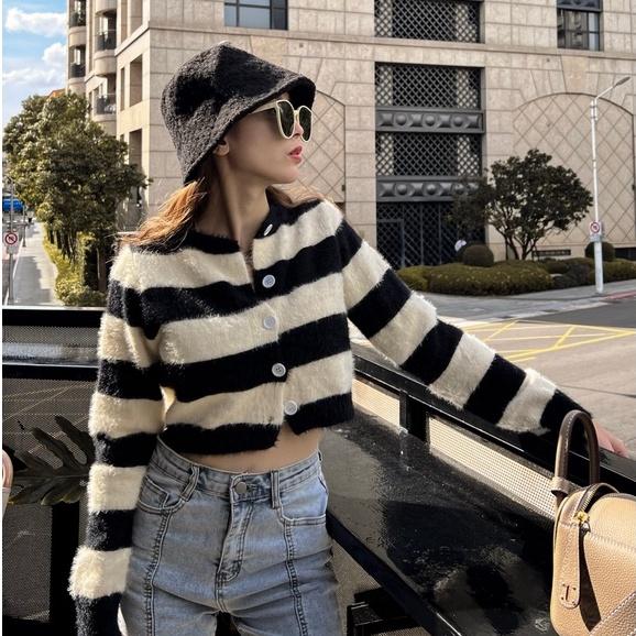 【DOE.FF】條紋撞色鈕扣短外套(現貨)短版毛衣 水貂毛 針織外套 毛衣女 短版上衣 女裝 歐美 辣妹 針織衫 上衣女