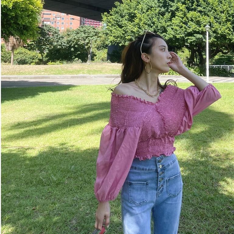 【DOE.FF】 縮腰一字領V領上衣 (現貨) 上衣女 一字領上衣 露肩上衣 短版上衣 顯瘦上衣 女裝 辣妹風 小香風