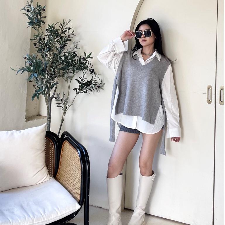 【DOE.FF】襯衫寬肩背心套裝 (現貨) 套裝女 寬鬆毛衣 下半身失蹤 襯衫女 針織背心 孕婦裝 長袖襯衫 V領毛衣