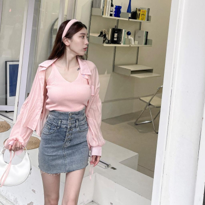 【DOE.FF】 針織抽繩襯衫兩件套 (現+預) 背心女 針織背心 套裝女 短版上衣 襯衫 襯衫女 短版襯衫 上衣女