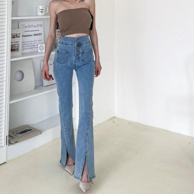 【DOE.FF】 韓國高腰五釦開岔喇叭褲 (現貨) 長褲女 顯瘦長褲 喇叭褲 高腰長褲 排扣長褲 貼身長褲 牛仔褲